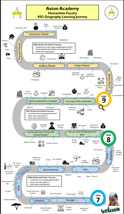 At Aston Academy, the Geography curriculum is designed to challenge students' understanding, developing their critical thinking skills and cultural literacy, by applying their knowledge to a range of concepts and contexts. Geographical skills and links to core subjects are also embedded throughout the curriculum. In doing so, students will learn to think, read, write and speak like a Geographer, whilst becoming well-rounded and responsible global citizens.